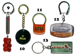 Normalerweise ist die Insel des 5-Uhr-Tees viel berüchtigter für ihre Königsgeschichten, doch in der europäischen Luftfahrt läuft ihnen die KLM den Rang ab. Man trägt dort nicht nur die "Könige" im Namen, sondern auch die stilisierten Krone (10) des holländischen Königshauses im Logo. Seit einigen Jahren nimmt der Charter-Flugverkehr am Himmel ständig zu. Einer der großen Carrier ist die deutsche LTU, die uns einen hübschen Anhänger (11) überlassen hat. Exponat 12 zeigt eine Air France Boeing 747, die im Frachtverkehr